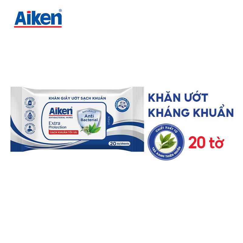 Sản phẩm khăn giấy ướt diệt khuẩn Aiken cũng là cái tên quen thuộc đối với nhiều người dùng hiện nay. Trong loại khăn ướt này có chứa chiết xuất bạc hà, cam thảo, trà xanh lên men, lemon myrtle,... mang đến hiệu quả khử mùi hôi, diệt khuẩn tốt để bảo vệ cơ thể khỏi các tác nhân xấu có trong môi trường. Đồng thời bạn sẽ có cảm giác dễ chịu, thư giãn hơn nhờ vào hương thơm nhẹ nhàng trong khăn ướt.
